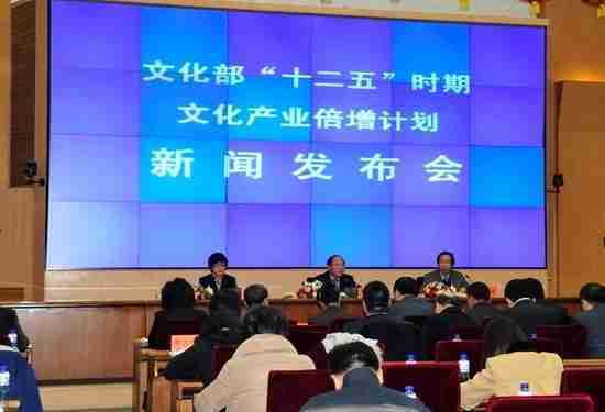 2月28日下午,,,,文化部在京召开新闻发布会,,正式向社会发布《文化部“十二五”时期文化产业倍增计划》,,,提出了 “十二五”期间文化部门管理的文化产业增加值年平均现价增长速度高于20%,,,2015年比2010年至少翻一番,,,,实现倍增的奋斗目标。。